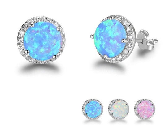 925 Sterling Silver Earrings Round Opal with Cubic Zirconia